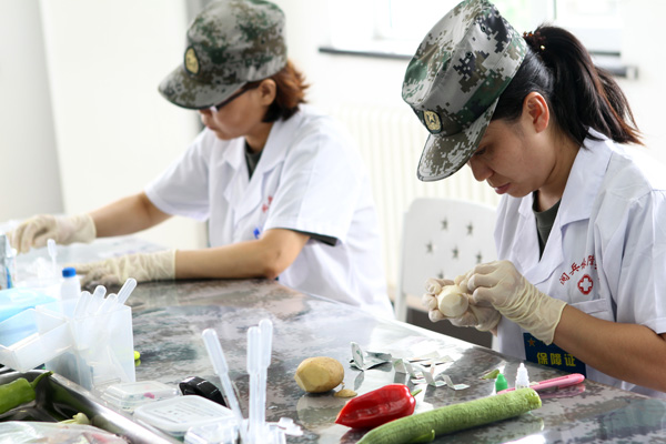 Staff members carry out quarantine checks for food to be served to soldiers training for the military parade. [Photo by Zou Hong/China Daily]