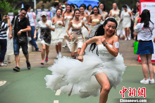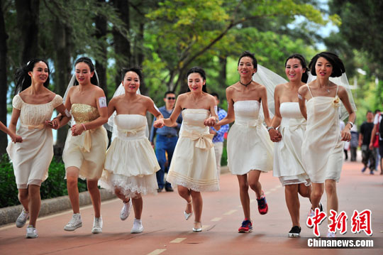 More than 100 women in wedding dress participate in a fun running activity held in a park in Kunming, southwest China's Yunnan province on Aug.22. The activity is aimed to convey healthy living ideas to public. (Photo/CNS)
