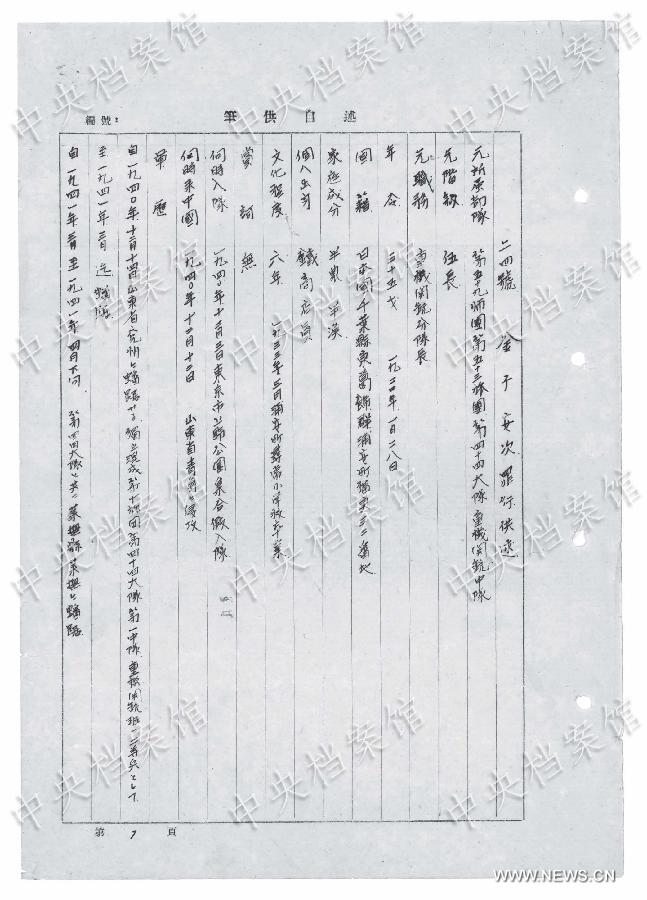 Photo released on Aug. 27, 2015 by the State Archives Administration of China on its website shows an excerpt from Japanese war criminal Yasuji Kaneko's handwritten confession. (Xinhua)