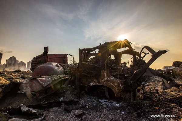 Photo taken on Aug. 27, 2015 shows the burnt vehicle at the core area of the warehouse explosion site in north China's Tianjin. [Photo: Xinhua/Zhu Wei]