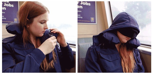 A neck pillow in the hood that inflates in two seconds and an eye mask for shutting out the light.(Photo/baubax.com)