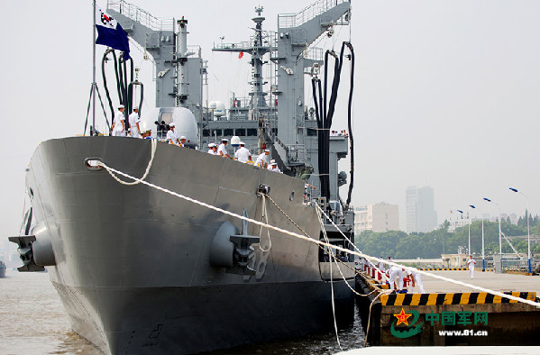 The supply ship ROKS Taechong (AOE-58) from the ROK Navy berths at the Wusong Military Port in Shanghai on August 29, 2015. A navy fleet consisted of the guided-missile destroyer Gang Gam-chan and the supply ship ROKS Taechong (AOE-58) from the Navy of the Republic of Korea arrived at the Wusong Military Port in Shanghai, China, on August 29 for a three-day port visit. (Photo.81.cn)