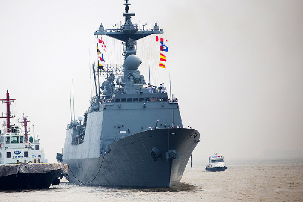 The guided-missile destroyer Gang Gam-chan from the ROK Navy prepares to berth at the Wusong Military Port in Shanghai on August 29, 2015. A navy fleet consisted of the guided-missile destroyer Gang Gam-chan and the supply ship ROKS Taechong (AOE-58) from the Navy of the Republic of Korea arrived at the Wusong Military Port in Shanghai, China, on August 29 for a three-day port visit.