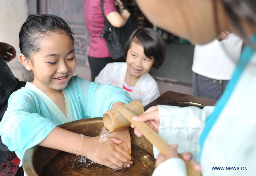 A new first-grader washes her hands during a first writing ceremony at the Confucius Temple in Fuzhou, capital of southeast China's Fujian Province, Aug. 30, 2015. Ten new first-graders in Fuzhou participated in the first writing ceremony Sunday. The ceremony is a traditional education activity for children who will start their school life in China. [Photo: Xinhua]