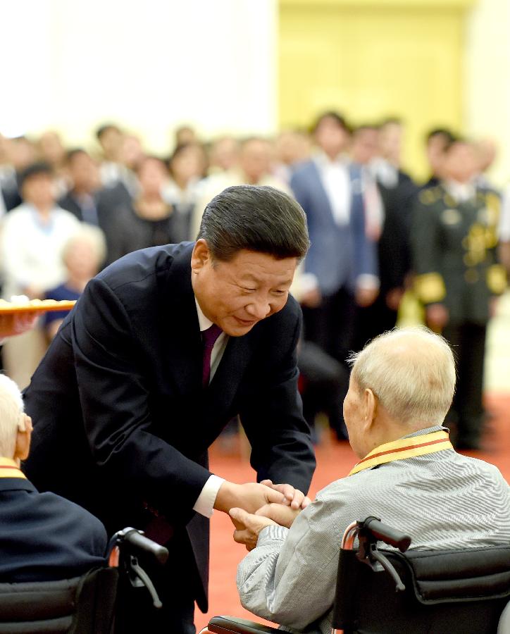 Chinese President Xi Jinping (L) grants medals to 30 Chinese and foreign veterans and civilians who fought for China in the World War II, at the Great Hall of the People in Beijing, capital of China, Sept. 2, 2015. (Xinhua/Li Xueren)