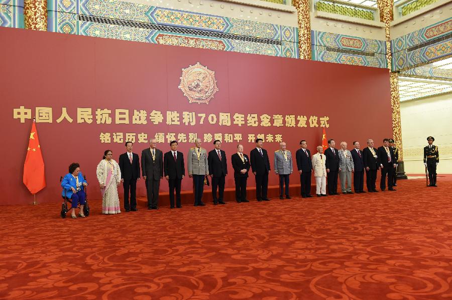 A medal awarding ceremony is held at the Great Hall of the People in Beijing, capital of China, Sept. 2, 2015. Chinese President Xi Jinping on Wednesday granted medals to 30 Chinese and foreign veterans and civilians who fought for China in the World War II. (Xinhua/Li Xueren)