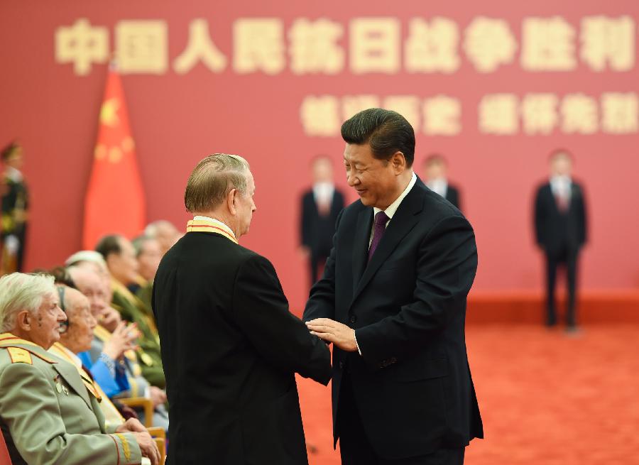 Chinese President Xi Jinping (R) grants medals to 30 Chinese and foreign veterans and civilians who fought for China in the World War II, at the Great Hall of the People in Beijing, capital of China, Sept. 2, 2015. (Xinhua/Xie Huanchi)