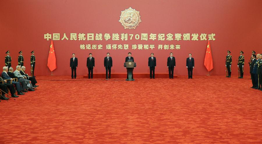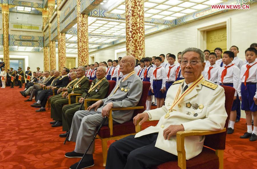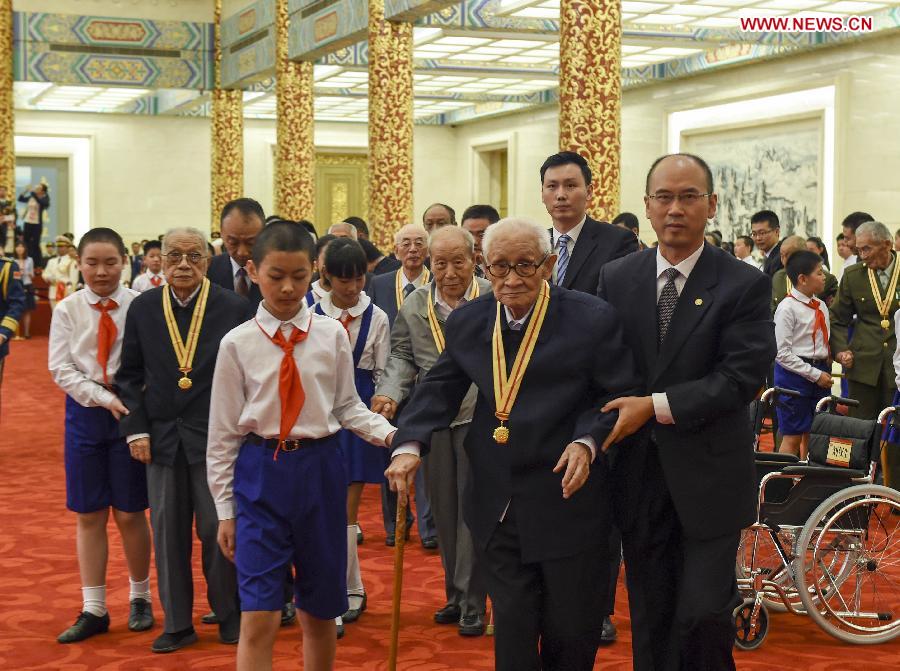 Chinese President Xi Jinping grants medals to 30 Chinese and foreign veterans and civilians who fought for China in the Chinese People's War of Resistance against Japanese Aggression at the Great Hall of the People in Beijing, China, Sept. 2, 2015. Some of the late veterans were represented by their relatives. (Xinhua/Pang Xinglei)