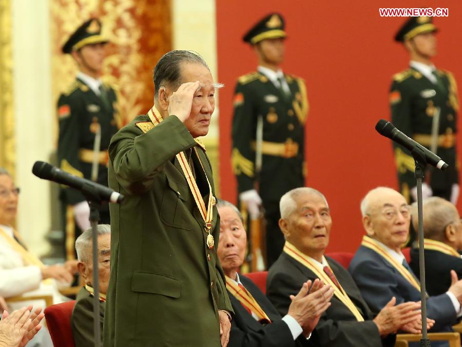 An award ceremony is held at the Great Hall of the People in Beijing, capital of China, Sept. 2, 2015. Chinese President Xi Jinping on Wednesday grants medals to 30 Chinese and foreign veterans and civilians who fought for China in the Chinese People's War of Resistance against Japanese Aggression, ahead of the country's grand V-Day celebration. Some of the late veterans were represented by their relatives. (Xinhua/Rao Aimin)