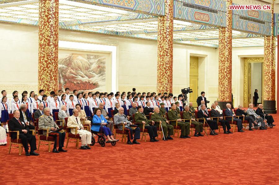 An award ceremony is held at the Great Hall of the People in Beijing, capital of China, Sept. 2, 2015. Chinese President Xi Jinping on Wednesday grants medals to 30 Chinese and foreign veterans and civilians who fought for China in the Chinese People's War of Resistance against Japanese Aggression, ahead of the country's grand V-Day celebration. Some of the late veterans were represented by their relatives. (Xinhua/Pang Xinglei)