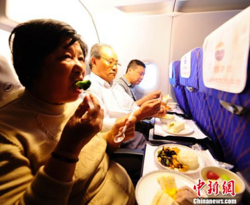 Passenger enjoy hot meals on an airplane. (File photo/chinanews.com)
