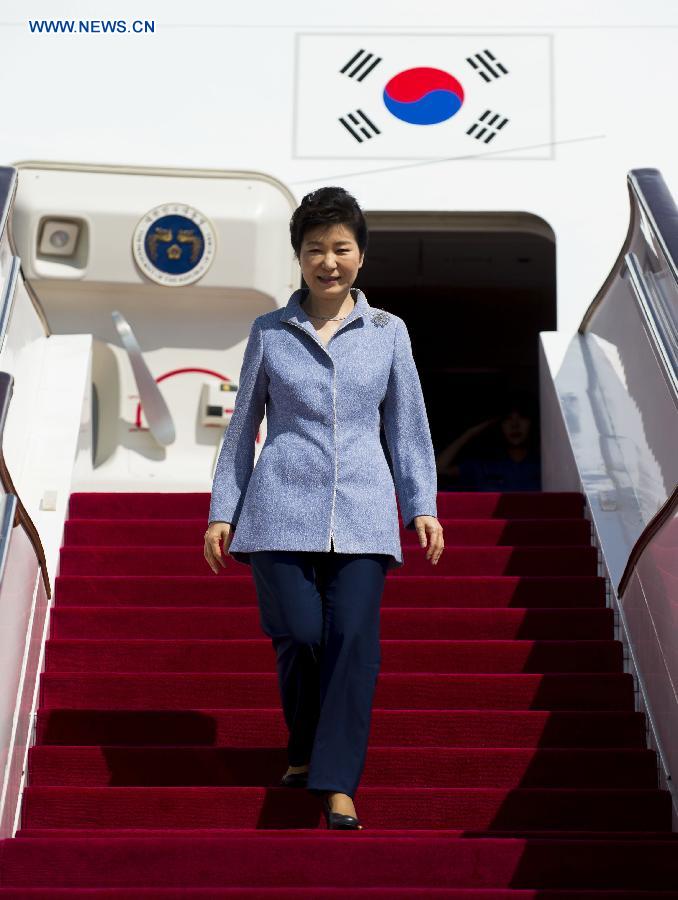 BEIJING, Sept. 2 -- On the morning of September 2, Republic of Korea (ROK) President Park Geun-hye arrived at Beijing Capital International Airport for three-day visit to China. During the visit, she will attend commemorative activities marking the 70th anniversary of the victory of Chinese People’s War of Resistance against Japanese Aggression and the World Anti-Fascist War. This is her third visit to China since Park Geun-hye took office as ROK President.