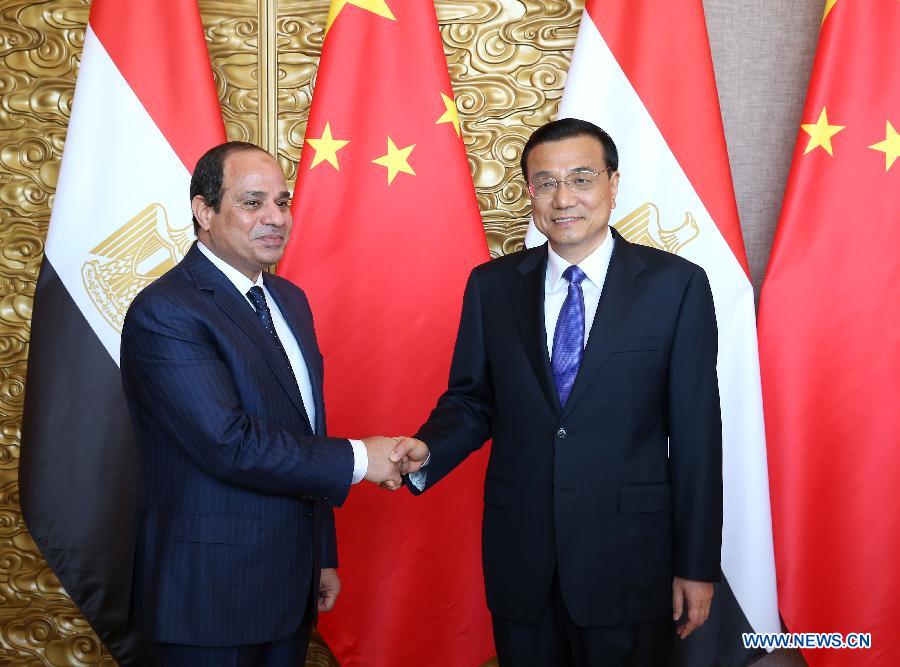 Chinese Premier Li Keqiang (R) meets with Egyptian President Abdel Fattah al-Sisi in Beijing, capital of China, Sept. 2, 2015. Sisi is here to attend the commemoration activities of the 70th anniversary of the victory of Chinese People's War of Resistance Against Japanese Aggression and World Anti-Fascist War. (Xinhua/Pang Xinglei)