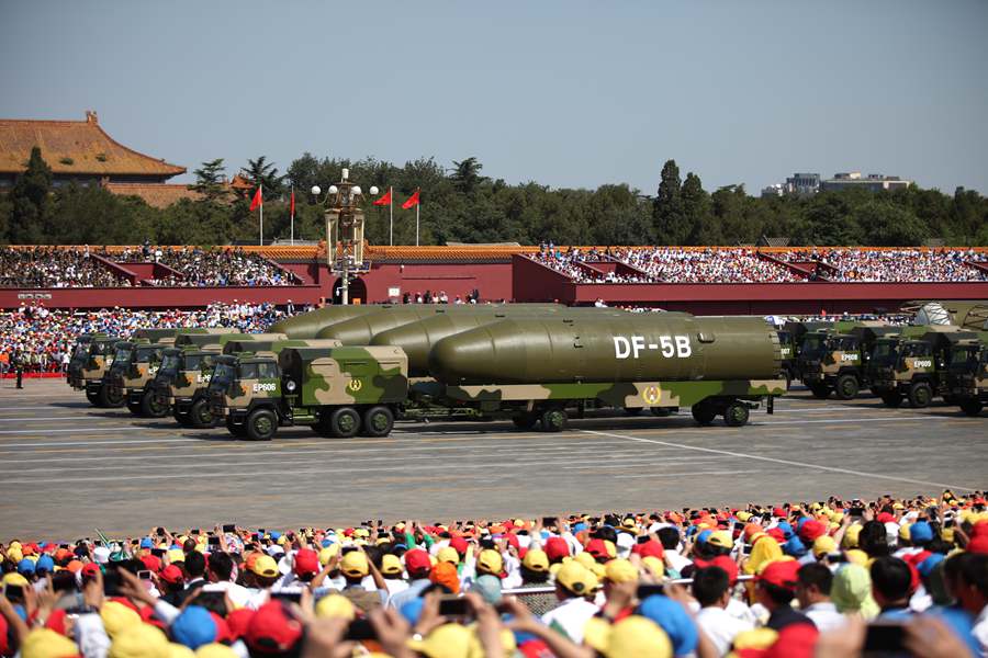 Military vehicles carry DF-5B short-range ballistic missiles during the military parade to mark the 70th Anniversary of the end of World War II, in Beijing, September 3, 2015. [Photo/People's Daily Online]
