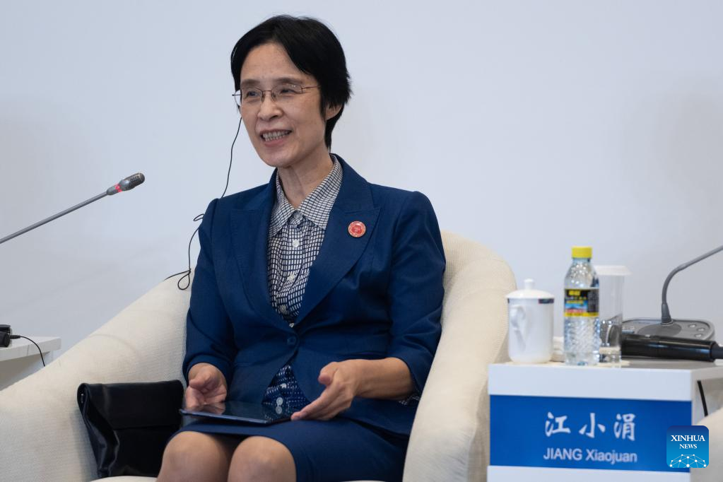 Jiang Xiaojuan, a member of the National People's Congress standing committee and chairperson of the Chinese Public Administration Society, speaks at a session titled