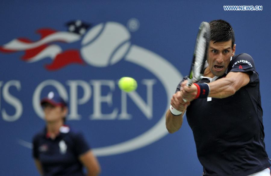 Novak Djokovic of Serbia returns a ball during the men's singles third round match against Andreas Seppi of Italy at the 2015 US Open in New York, the United States, Sept. 4, 2015. Novak Djokovic won 3-0 to enter the next round. (Xinhua/Wang Lei)