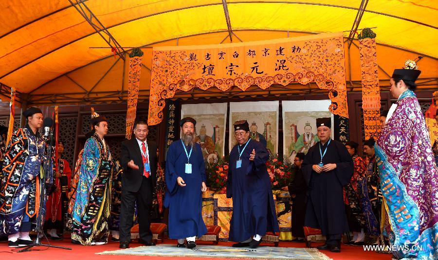 Taoists hold the praying ceremony at Baiyun temple in Beijing, capital of China, Sept. 4, 2015. Religious circles in China on Friday held praying and various activities to commemorate the 70th anniversary of the victory of the Chinese People's War of Resistance Against Japanese Aggression and the World Anti-Fascist War.(Xinhua/Zhang Ling)