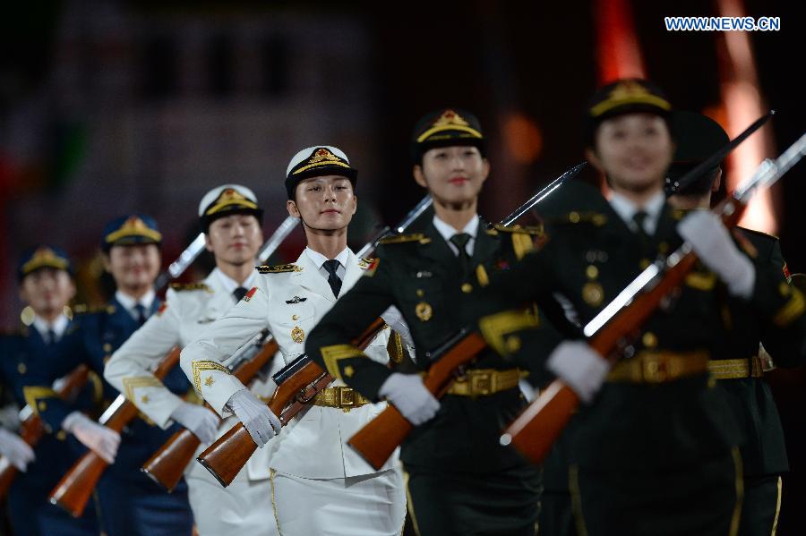 Women guards of honor of China's People's Liberation Army perform during general rehearsal of Kremlin Military Tattoo "Spasskaya Bashnya" on Red square in Moscow, Russia, Sep. 4, 2015. (Xinhua/Pavel Bednyakov)