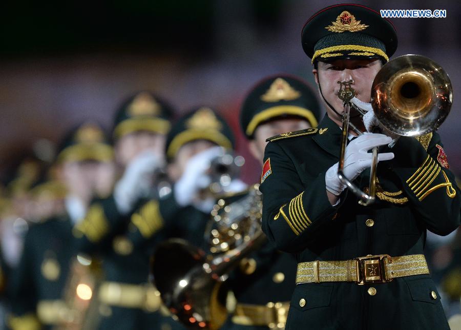 China's Military band of the People's Liberation Army perform during general rehearsal of Kremlin Military Tattoo "Spasskaya Bashnya" on Red square in Moscow, Russia, Sep. 4, 2015. (Xinhua/Pavel Bednyakov)