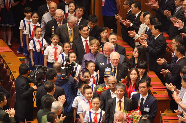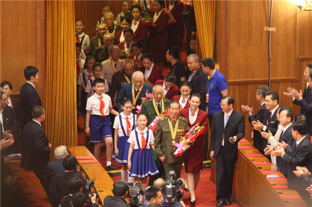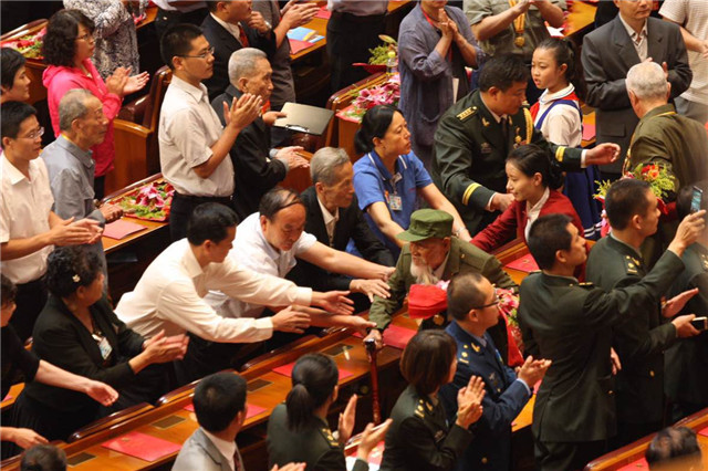 The audience stand up and applause for veterans from home and abroad as they step into the Great Hall of the People in Beijing on September 3, 2015. [Photo by Wang Zhuangfei / China Daily App]