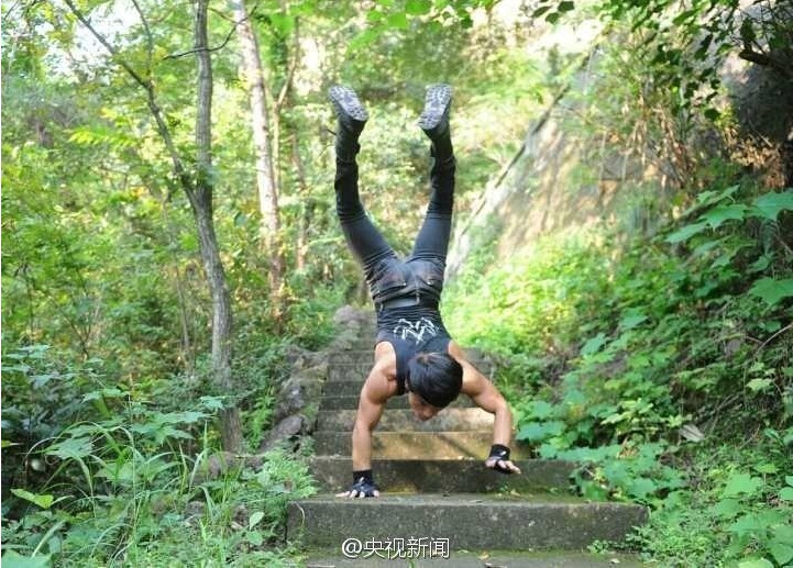 A year ago, a video of a foreigner handstanding on the edge of a cliff inspired Ying Ming. He started to practice handstand everywhere he could think of. After getting good at handstanding, Ying Ming started to walk on his hands. At the end of August, he climbed up Yongkang Shiguliao with his hands. And at the beginning of September, he climbed up the Yongkang Yuanzhou Village great wall with hundreds of steps. (Photo/Weibo)