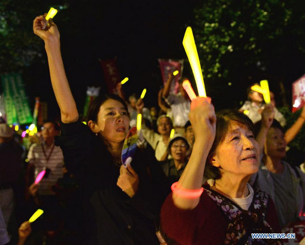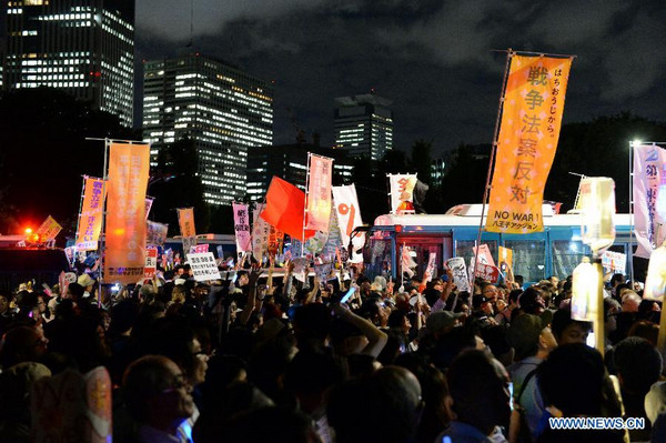 Protestors rally in front of the parliament building in Tokyo, Japan, on Sept. 14, 2015. Some 45,000 Japanese protestors rallied in front of the country's parliament building in downtown Tokyo late Monday against the government-backed security bills, trying to stop a possible passage of the controversial legislation in the Diet's upper house this week. (Xinhua/Ma Ping)