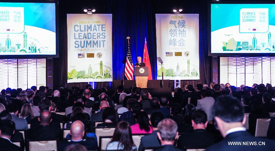 U.S. Vice President Joe Biden addresses the closing ceremony of "China-U.S. Climate-Smart/Low Carbon Cities Summit," in Los Angeles, the United States, on Sept. 17, 2015. Yang Jiechi, the Special Envoy of Chinese President Xi Jinping and U.S. Vice President Joe Biden attended the closing ceremony on Wednesday of "China-U.S. Climate-Smart/Low Carbon Cities Summit," which is short for the second China-U.S. Climate Leaders Summit. (Xinhua/Zhang Chaoqun)