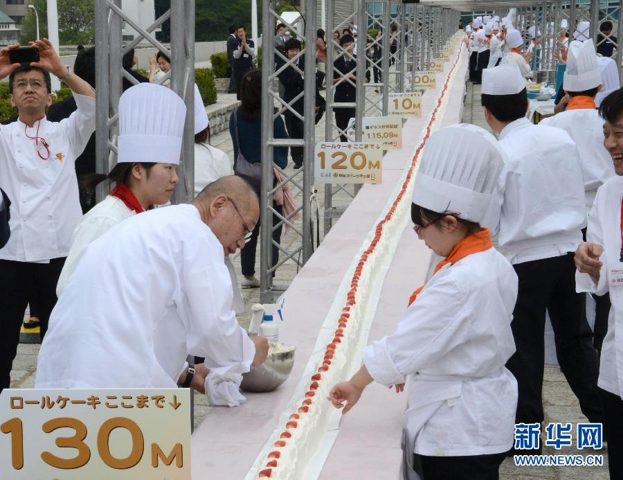 A team of 90 patissiers and students made a 130.68 meters long roll cake at the catering college in Tokyo on April 18, 2013. The cake used 54kg of flour, 43kg of sugar and 2,682 eggs. It was declared the world's longest roll cake by Guinness World Records. The team beat the previous record of 115.09m which was also made in Japan in 2011. (Photo/Xinhua)