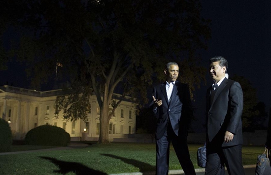 President Xi Jinping and President Obama walk on the North Lawn of the White House. (Photo/Xinhua)