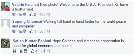 Some others wish President Xi had a fruitful visit to US. Some also put up suggestions for a better Sino-US relationship and cooperation. Inspired by the commentary on People’s Daily Online - "The four things that will improve China-US relations", one user leaves the suggestions for mutual trust: Listen to each other; do more to benefit both sides; accentuate the commonalty; and let people visit each other more easily.