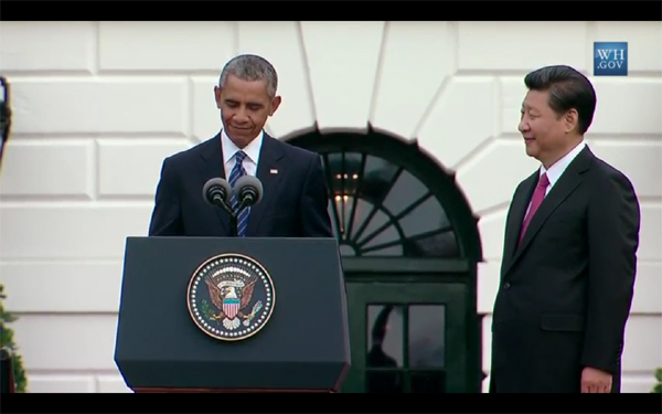 US President Barack Obama (L) makes a speech during an official ceremony to welcome Chinese President Xi Jinping and First Lady Peng Liyuan at the White House in Washington September 25, 2015. [Photo/www.whithouse.gov]