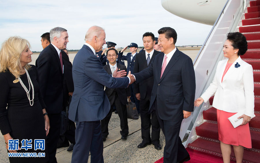 Chinese President Xi Jinping and his wife Peng Liyuan are welcomed by US vice-president Joe Biden and his wife after they arrive in Washington DC, Thursday.