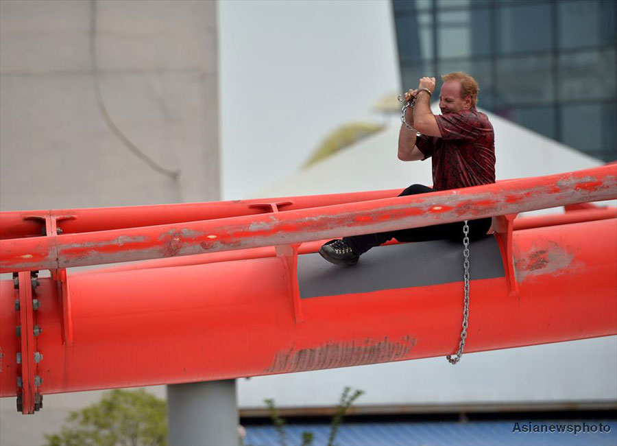 Dean Gunnarson attempts to escape from the locks on the track of the roller coaster at a theme park in Wuhan, central China's Hubei Province on September 28, 2015. As a heavy-weight magician invited by Happy Valley, the theme park, Gunnarson will perform a high-altitude escape twice there from October 1 to 7. [Photo: Asianewsphoto]