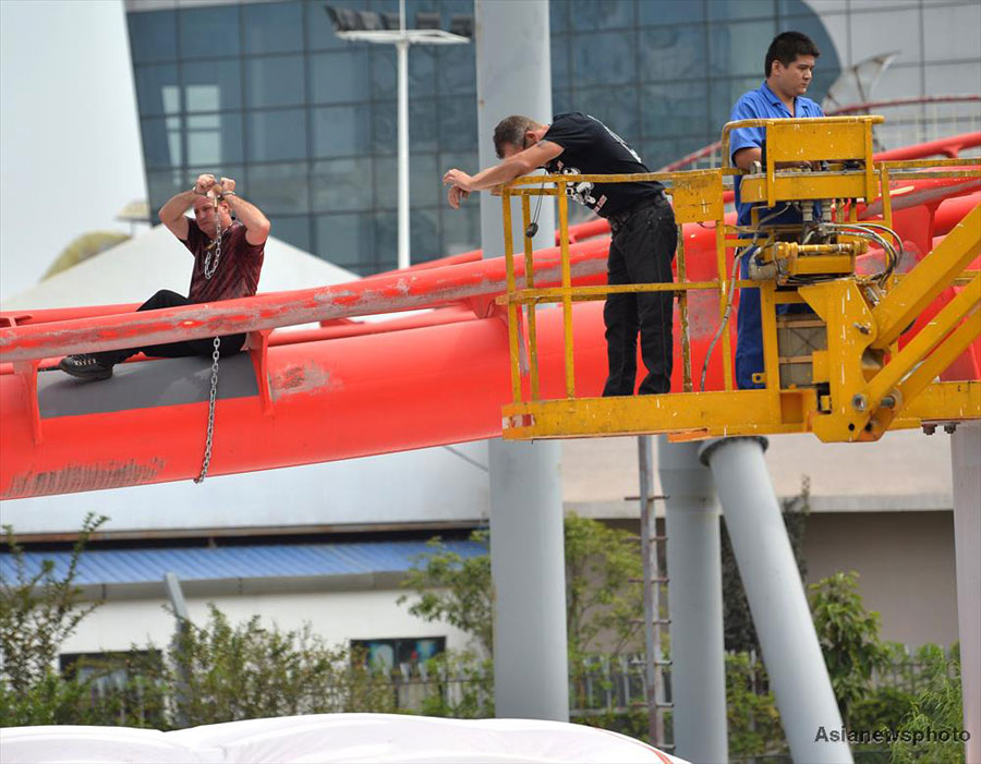 Magician Dean Gunnarson is locked on the track of the roller coaster at a theme park in Wuhan, central China's Hubei Province on September 28, 2015. Locked by handcuffs, five locks and several iron chains, the world-famous escape master had 35 seconds to unbind himself before the roller coaster approached at a speed of 135 km per hour. [Photo: Asianewsphoto]