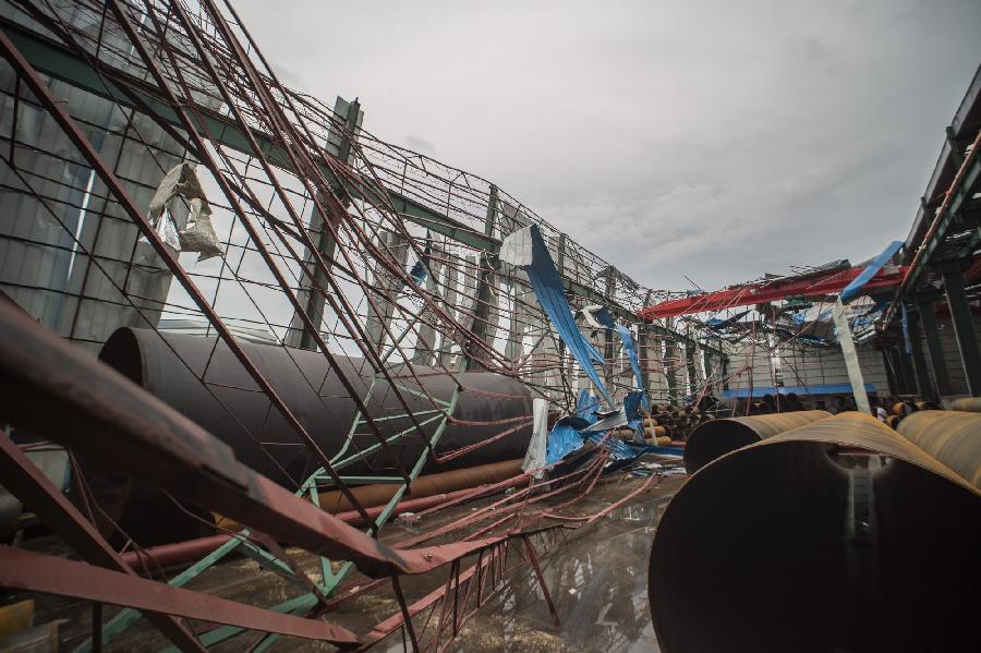 Photo taken on Oct. 5, 2015 shows a plant building destroyed by tornado at Lecong Township of Foshan City, south China's Guangdong Province. (Xinhua/Chen Yonghong)