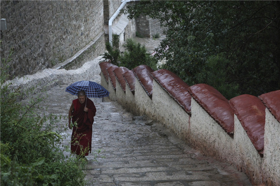 A Buddhist monk walks in the rain at Drepung Monastery in Lhasa. [Photo By Wang Zhuangfei / China Daily]