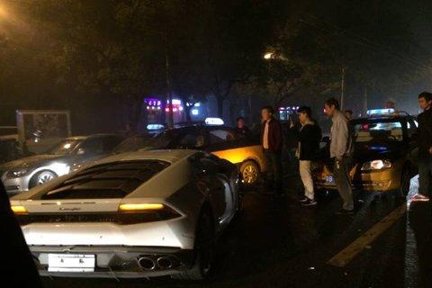 A Lamborghini crashed into eight cars in a row while speeding around 4:20 a.m. on October 6, outside the north gate of the Workers’ Stadium in Beijing, capital of China. One was injured. The driver of the luxury sports car left the car and fled.