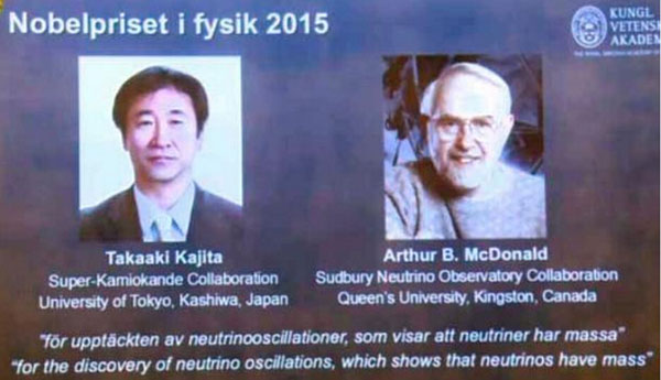 The Royal Swedish Academy of Sciences said the two researchers had made key contributions to experiments showing that neutrinos change identities as they whiz through the universe at nearly the speed of light.