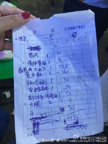 A Net user posted a bill on Sina Weibo, saying that a restaurant in Qingdao charged her 3,000 yuan for crabs without crab legs.