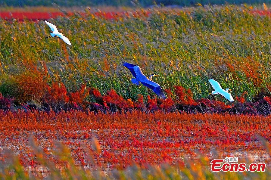 A large group of migratory birds temporarily take up residence in the Beidagang wetland nature reserve, a key stop on their migration paths, in north China's coastal city of Tianjin, Oct. 8, 2015. (Photo: China News Service/Tong Yu)