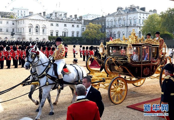 Earlier in the day, Prince Charles, heir to the throne, and the Duchess of Cornwall greeted President Xi Jinping and his wife Peng Liyuan at the Mandarin Oriental Hotel and escorted them to Horse Guards Parade.