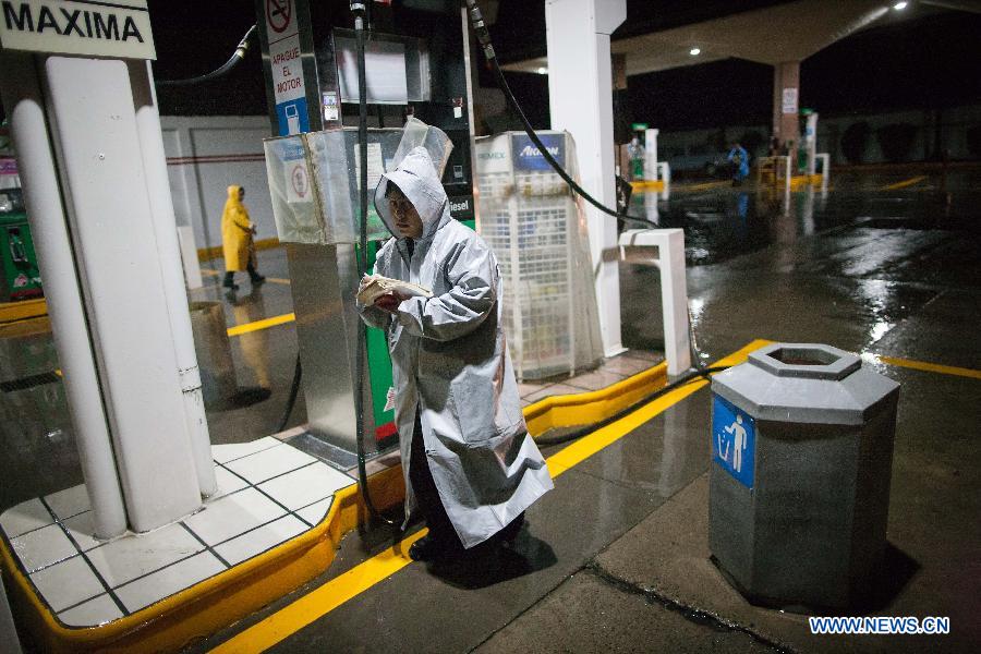 Workers of a gas station prepare for the arrival of hurricane "Patricia" in Ameca, Jalisco state, Mexico, on Oct. 23, 2015. An hour after Hurricane Patricia made landfall Friday evening in the Mexican state of Jalisco, bringing strong winds and heavy rain over the west of the country, it was downgraded to a Category 4 hurricane. (Xinhua/Pedro Mera)