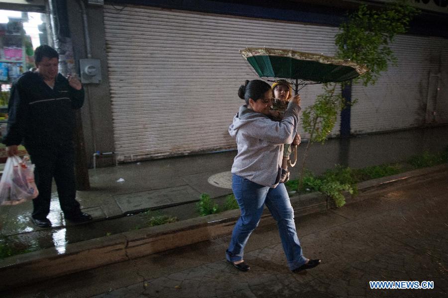 A woman walks in the rain caused by the huricane "Patricia" in Ameca, Jalisco state, Mexico, on Oct. 23, 2015. An hour after Hurricane Patricia made landfall Friday evening in the Mexican state of Jalisco, bringing strong winds and heavy rain over the west of the country, it was downgraded to a Category 4 hurricane. (Xinhua/Pedro Mera)