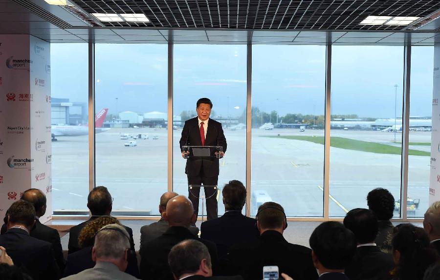 Chinese President Xi Jinping addresses dignitaries during a visit to the airport city in Manchester, Britain, Oct. 23, 2015. (Xinhua/Zhang Duo)
