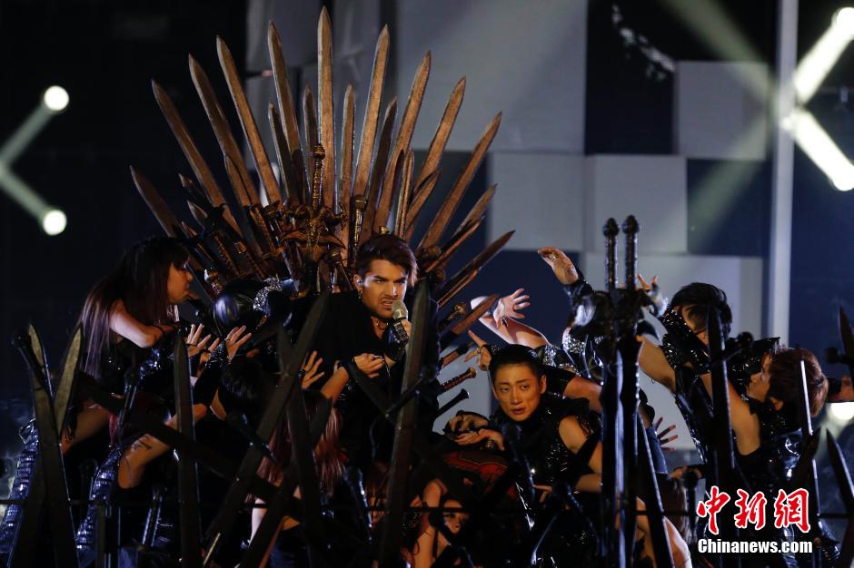 Adam Mitchel Lambert, an American pop singer, performs on 2015 Tmall 11.11 Global Shopping Festival at the National Aquatics Center in Beijing on the night of Nov.10, 2015.(CNS/Han Haidan)