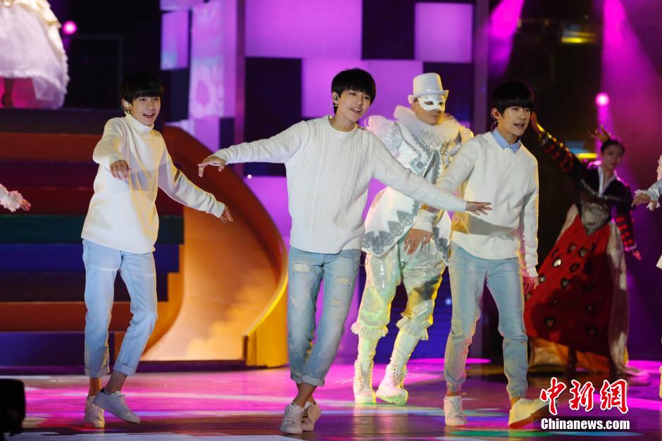 TFBOYS, a Chinese brand, performs on 2015 Tmall 11.11 Global Shopping Festival at the National Aquatics Center in Beijing on the night of Nov.10, 2015. (CNS/Han Haidan)