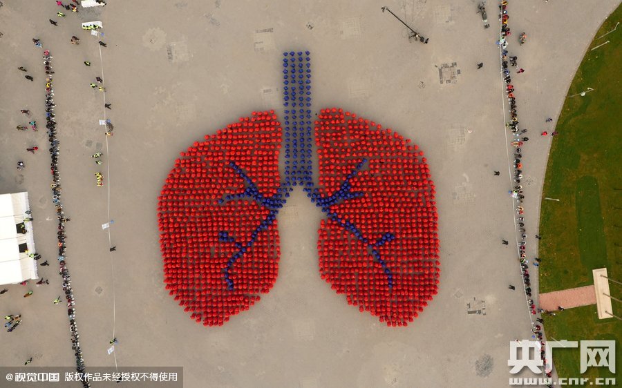 Over 1,500 people formed a giant pattern of a pair of lungs in a smog-cloaked Beijing on Nov 15, breaking the Guinness world record of the largest human image of an organ.
