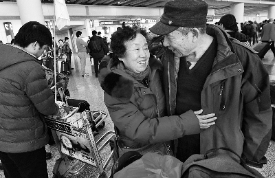 A couple hugs each other after they walk out the checkpoint. This couple has just arrived in Beijing after their trip to France.