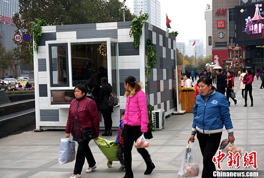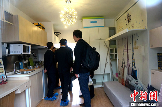 A tiny apartment is shown in the street in Zhengzhou, central China's Henan province on Nov. 18. Within a small space of only 25 square meters, the apartment contains a kitchen, a big bed, a toilet, bookcases and other living facilities. People can fold the big bed to make space for the living room. People call it "an ideal home for single office workers". (CNS/Wang Zhongju)