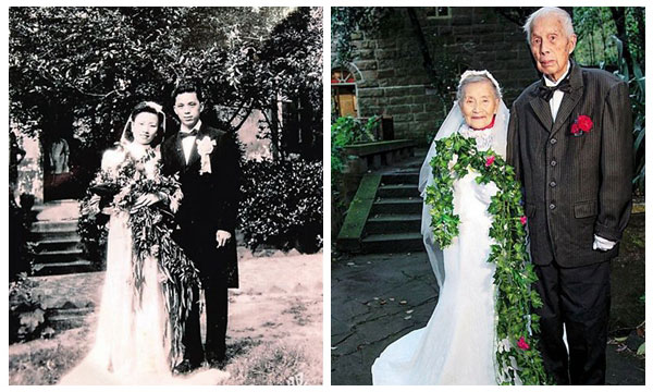 The left is wedding photo of Cao Yuehua and his wife Wang Deyi, taken in 1945. The right is the photo of the couple taken in 2015.